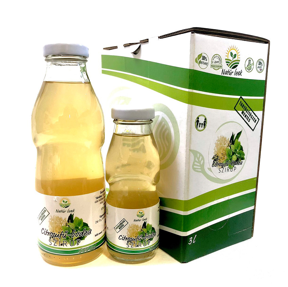 A citromfű és a bodza népi gyógyászati hatása A citromfű vírusölő, ideg- és szívnyugtató, görcsoldó, serkenti az emésztést, enyhíti az idegességet és szerepe van a depresszió oldásában is. Gyomorrontás, gyomorsavtúltengés, hányinger, puffadások idején különösen javasolt gyógynövény. A fekete bodza enyhe hashajtó, fájdalomcsillapító, immunerősítő és izzasztó hatású. Tartalmaz A- és B-vitamint, C-vitamint, ennek mennyisége duplája, a citrusfélékben találhatónak. Fontos ásványi anyag és mikroelem forrás. Összetevők Víz, cukor, bodzavirág, citromfű, citromlé. Ajánlott felhasználása Limonádéba cukor helyett, vízzel vagy szódával hígítva, koktélokba összetevőként adhatjuk. Jégkása, jégkocka is készülhet belőle, amellyel meglephetjük vendégeinket. Süteményekre öntetként, illetve cukor helyett alapanyagként is felhasználható.