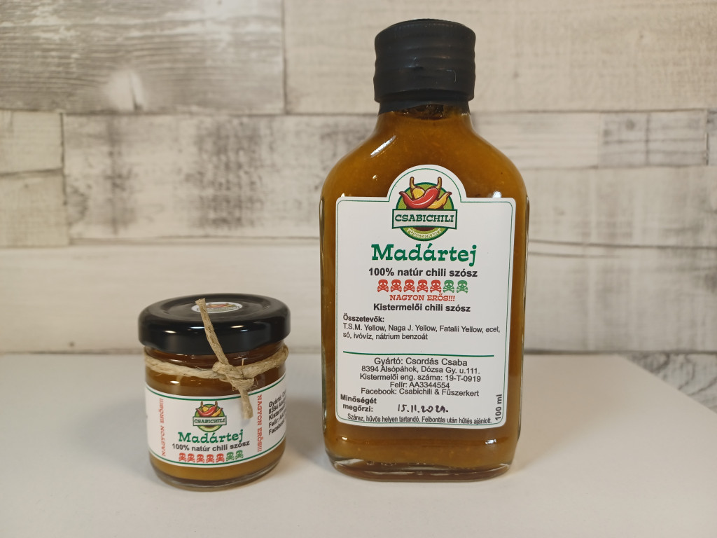 Madártej 100ml (100% natúr chili szósz) Nagyon erős! Na nem az a klasszikus habos babos finomság, ami először eszünkbe jut a név hallatán! Igazából a színe stimmel, de ha véletlenül még is nagyobb adagot kóstolnál, valószínűleg úgy érzed majd hogy akár repülni is tudnál!( A hűtőig biztos!) A sárga moruga és jolokia karakteres ízét a fatalii próbálja némileg enyhíteni! Sokak szerint isteni zamata van! T.S.M. Yellow chili, Naga Joloika Yellow chili, Fatalii Yellow chili