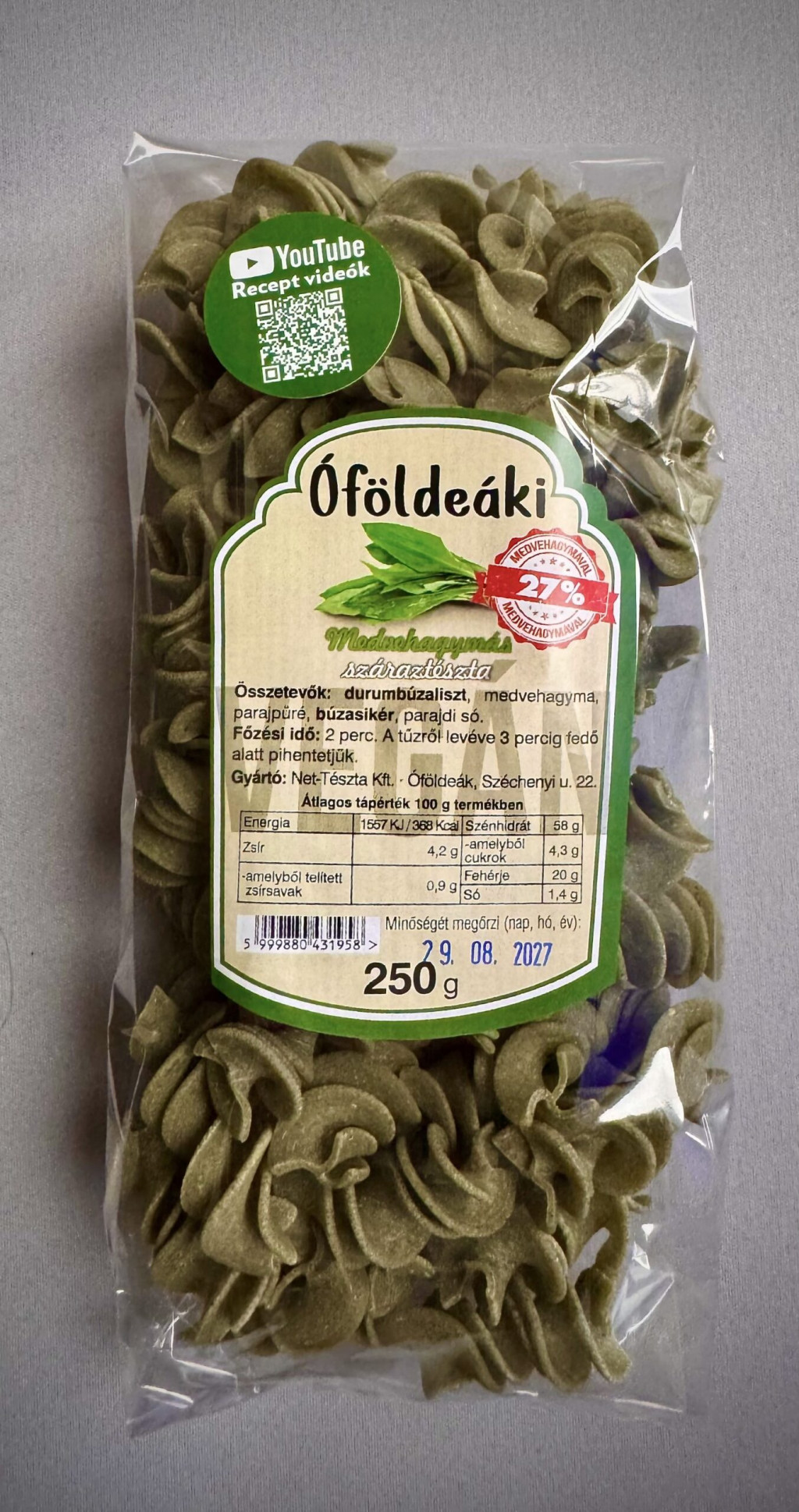 Termék neve: Medvehagymás Fusilletti – Óriás orsó tészta Kiszerelés: 250 g – 2–4 főre Zöldségtartalom: 27% A medvehagyma friss, karakteres íze és a fusilletti óriási formája különlegessé teszi ezt a száraztésztát. Kiválóan megtartja a szószokat és egyedülálló harapásélményt nyújt. Egészségügyi előnyök Magas fehérjetartalom: támogatja az izomépítést. Alacsony glikémiás index: hozzájárul a kiegyensúlyozott vércukorszinthez. Vitaminokban gazdag: segíti az emésztést és erősíti az immunrendszert. A Medvehagymás Fusilletti az egyik legkülönlegesebb tésztánk: az óriás orsó forma bronz matricával készül, amely érdes felületet ad a tésztának, így minden szósz tökéletesen rátapad. A medvehagyma friss, enyhén fokhagymás íze izgalmassá teszi a fogásokat, miközben természetes zöld színt ad a tésztának. Tésztaforma A fusilletti nemcsak látványos, hanem kiváló harapásérzetet is ad. Tökéletes választás tartalmas főételekhez, szaftos húsok mellé vagy akár egy egyszerű olívaolajos sajtos tésztához is. Főzési idő Hagyományos módon: 2,5–3 perc forrásban lévő vízben, majd 2–3 perc pihentetés fedő alatt. Egyserpenyős módszer: Főzd együtt az étellel nagy serpenyőben, így minden íz és tápanyag a tésztában marad. Tápérték és előnyök Magas fehérjetartalom – támogatja az aktív életmódot. Alacsony glikémiás index – stabil vércukorszint. Durum búzalisztből készült – rugalmas, tökéletes állag. Tojásmentes – vegán és vegetáriánus étrendbe is illeszthető.