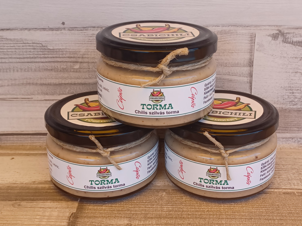 Chilis szilvás torma 200ml Csípős Kár is sokat rugózni rajta! Van a jó ecetes torma ( Már itt jól indul! ). Aztán van egy szuper szilvalekvárunk ( Bizony ez is jó! ) Mikor ezt a kettőt összeeresztjük, na, abból lesz ám az igazi csoda! O-ó, a chilit majdnem elfelejtettem! Pedig fontos hozzávaló!