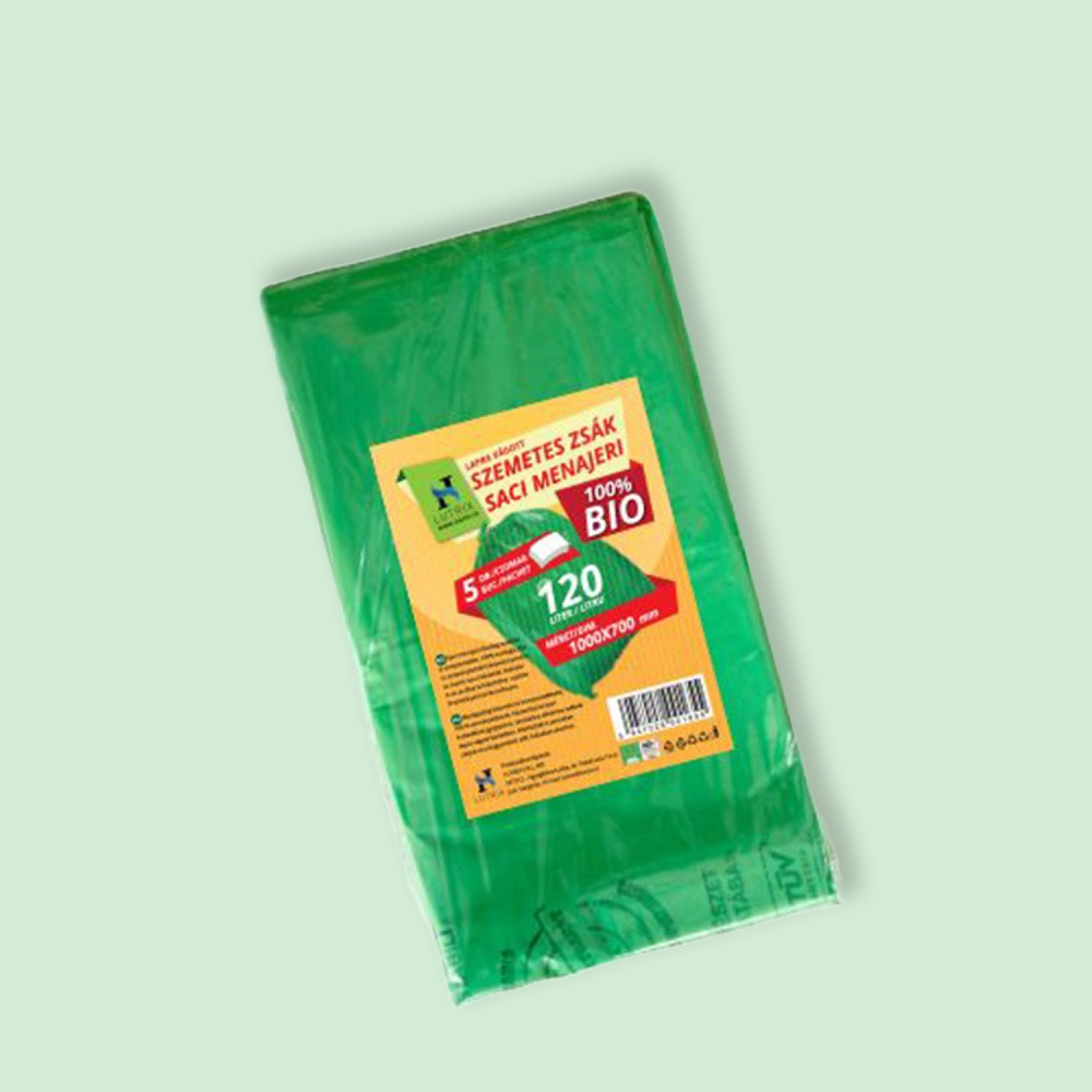 BIO extra erős lebomló szemeteszsák 120l, 100x70cm, 40mik, 5db/csomag Biológiailaglebomló és komposztálható -100% természetbarát Anyaga: PLA - egy keményítő alapú komposztálható bioplasztik, amelyet cukornád, kukorica vagy más cukortartalmú növény fermentálássalállítanak elő. Gyors a lebomlási ideje. Napfény, hő vagy mechanikai igénybevétel során apró darabokra, majd biológiailag természetes elemekrebomlanak le. 12 hónapos garancia ideje van megfelelő tárolási körülmények között.