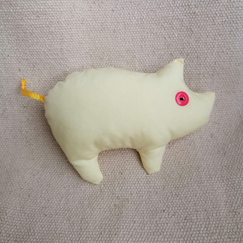 Legyen malacod az újévben! Szerencsehozó malacka újrafelhasznált alapanyagokból. Az újévi hiedelem szerint a malac az orrával előre túr, így a jövőbe mutat, és a szerencsét kitúrja nekünk a földből. Lehet dekoráció, ajándékkísérő, ha levendulás illóolajat csepegtetünk rá: relaxációs párnácska. Alapanyag: kevert szálas pamutvászon, sárga szalag, műanyag gomb, vatelin. A szerencsemalac 30 fokon mosható. Méret: 15 x 10 cm. Az ár 1 db-ra vonatkozik.