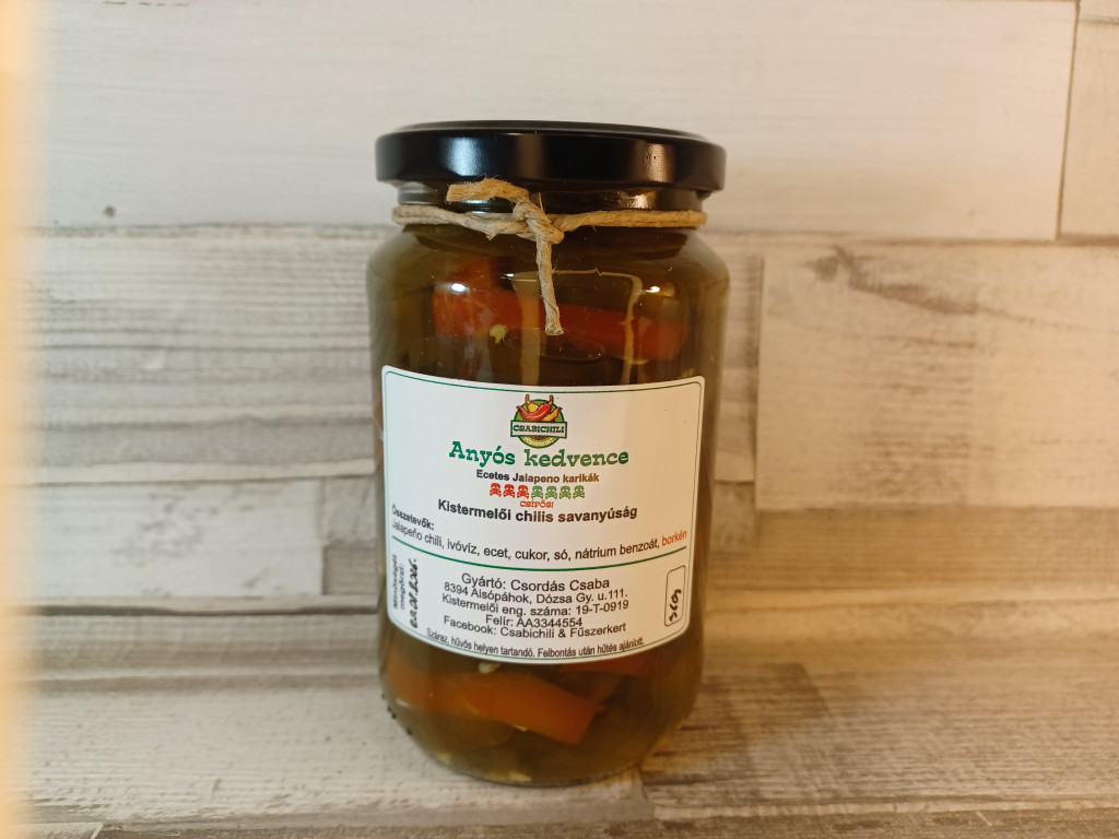 Az igazi klasszikus savanyúság! Az egyik legismertebb és egyben sokoldalúsága miatt a legkedveltebb chili a jalapeno. Gusztusos karikákra szelve. Hagyományos, ecetes savanyúságlében érlelve. Tuti, garantált minőség! A házi minőségellenőr ( Anyós ) által folyamatosan tesztelve.