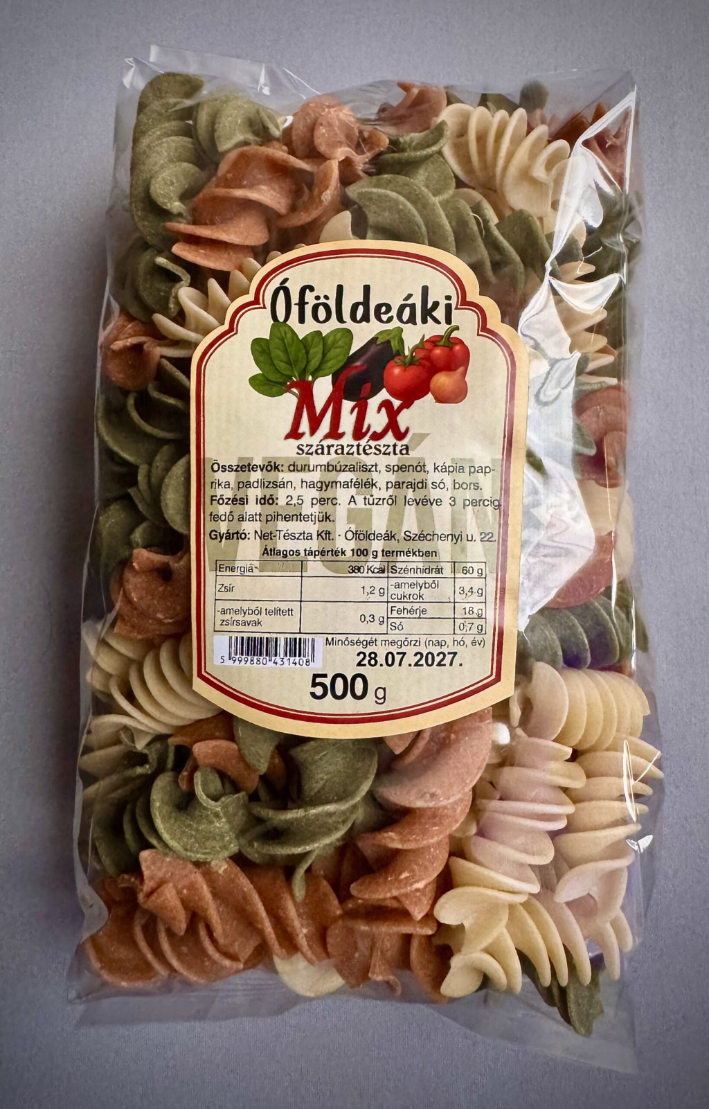Termék neve: Fusilletti MIX – Natúr durum, Zakuszkás, Spenótos Kiszerelés: 500 g – 4-6 főre Zöldségtartalom: spenótos – 38%, zakuszkás – 38% Három íz és három szín egy csomagban: a natúr letisztultsága, a zakuszka füstös karaktere és a spenót friss zöldje. Látványos tál, kompromisszummentes íz – családi vacsorákhoz tökéletes. Egészségügyi előnyök Magas fehérjetartalom; alacsony glikémiás index; tojásmentes. A Tricolor Fusilletti MIX az „egy csomag – három élmény” koncepció. A natúr a klasszikus alaphangot adja, a zakuszkás a sült paprika-padlizsán füstös mélységét hozza, a spenót üde, zöld frissességgel világítja be a tányért. A formák és a főzési idő azonos, így a három komponens egy fazékban, egyszerre készül el – tökéletes, ha többféle ízlést kell egyszerre kiszolgálni, vagy látványos, színes tálat szeretnél az asztal közepére varázsolni. Tálalási ötletek „Tri-colore” tál: olívaolaj + parmezán + citromreszelék. Sütőben: mascarpone-parmezán mártással. Party-sharing: három külön szósz (paradicsomos, tejszínes, pestós), az asztalnál keverhető. Tésztaforma A fusilletti nemcsak látványos, hanem kiváló harapásérzetet is ad. Tökéletes választás tartalmas főételekhez, szaftos húsok mellé vagy akár egy egyszerű olívaolajos sajtos tésztához is. Főzési idő Hagyományos módon: 2,5–3 perc forrásban lévő vízben, majd 2–3 perc pihentetés fedő alatt. Egyserpenyős módszer: Főzd együtt az étellel nagy serpenyőben, így minden íz és tápanyag a tésztában marad. Tápérték és előnyök Magas fehérjetartalom – támogatja az aktív életmódot. Alacsony glikémiás index – stabil vércukorszint. Durum búzalisztből készült – rugalmas, tökéletes állag. Tojásmentes – vegán és vegetáriánus étrendbe is illeszthető.