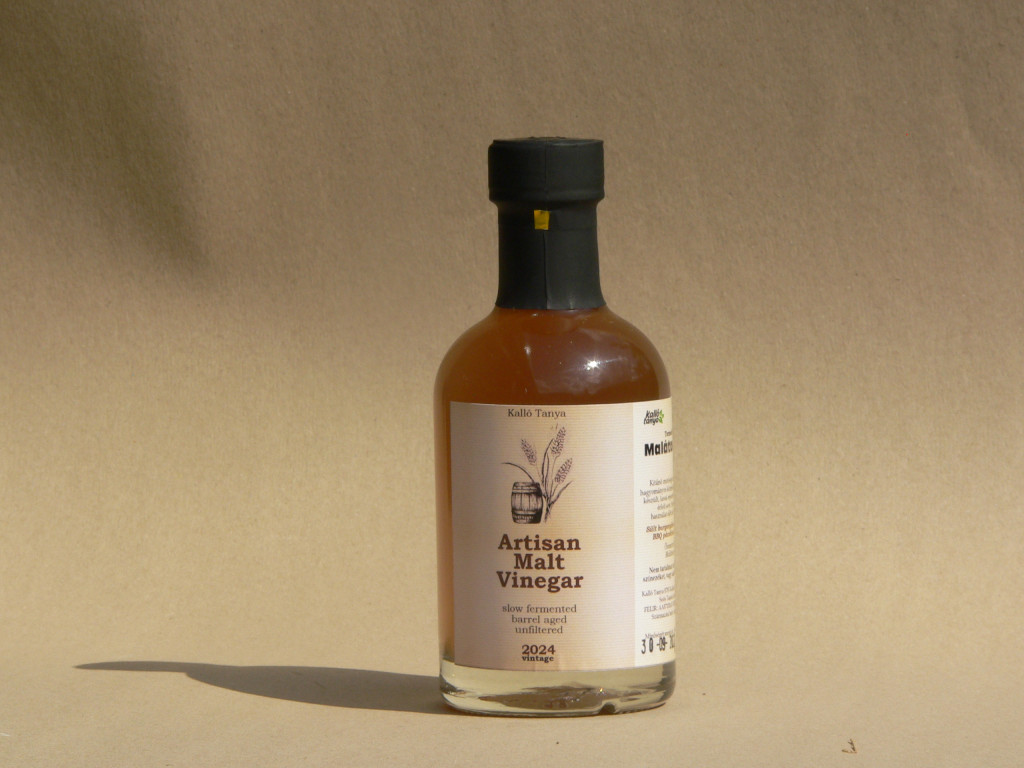 Lassú csíráztatású malátából, hagyományos Orleans-i módszerrel erjesztett, tölgyfa hordós érlelésű malátaecet. Kitűnően használható halakhoz, burgonyához, zöldségekhez és savanyításra. Nem tartalmaz adalékanyagokat. Összetevők: 100% malátaecet. Szűretlen.