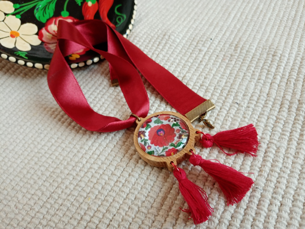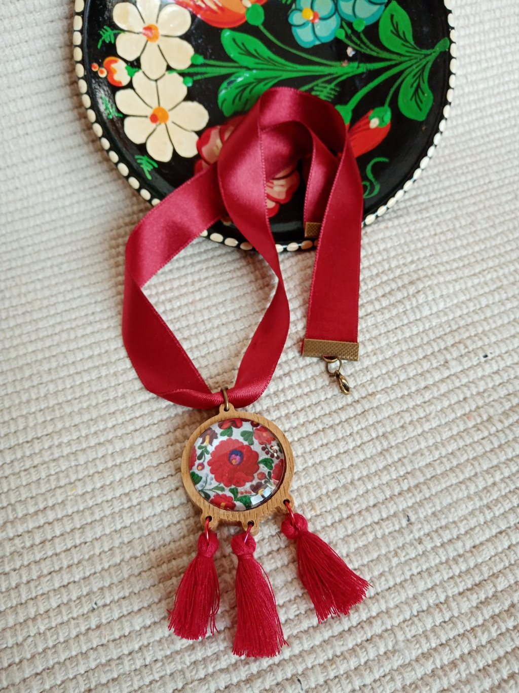 Kerek alakú faalapra készült matyó mintás magyaros nyaklánc, mely bordó selyemszalagon függ. A faalap tölgyből készült. Egyedi nyaklánc, Kapoccsal záródik.