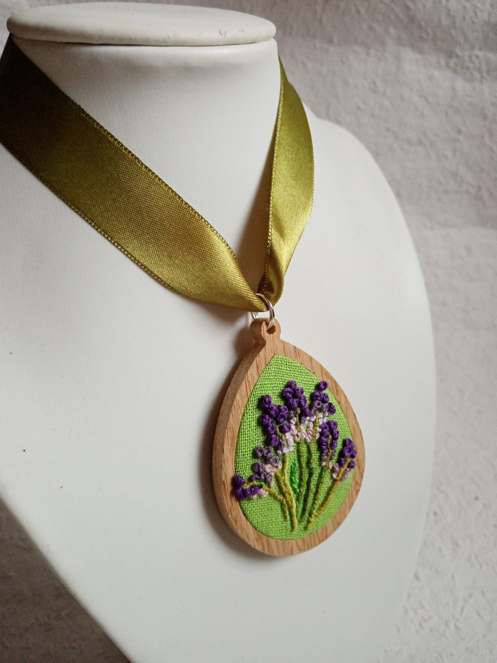 Lélekszépítő 3d hatású levendulát ábrázoló hímzett nyaklánc lenszöveten cseppalakú fakeretben. Zöld selyemszalaggal ellátva. Egyedi, megismételhetetlen darab Neked, ha szeretnéd meglepni a szeretteidet egy különleges darabbal!