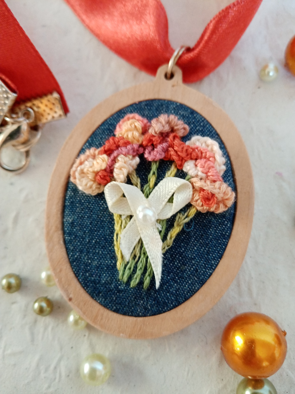 Hímzett bézs-barackszínű virágcsokor nyaklánc lenszöveten ovális alakú fakeretben. Rozsdapirosas kapcsos zsinórral ellátva. Mérete: 40 x 50 mm
