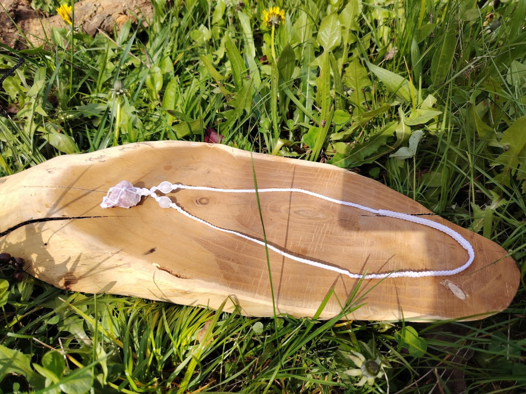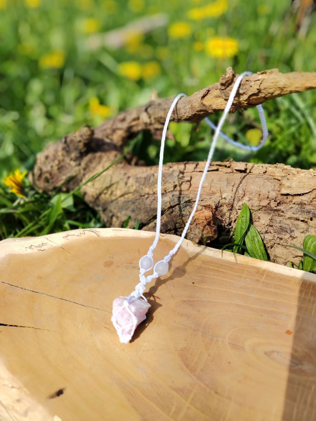 Rózsakvarc gyöngyökből kèszült makramè nyaklànc.