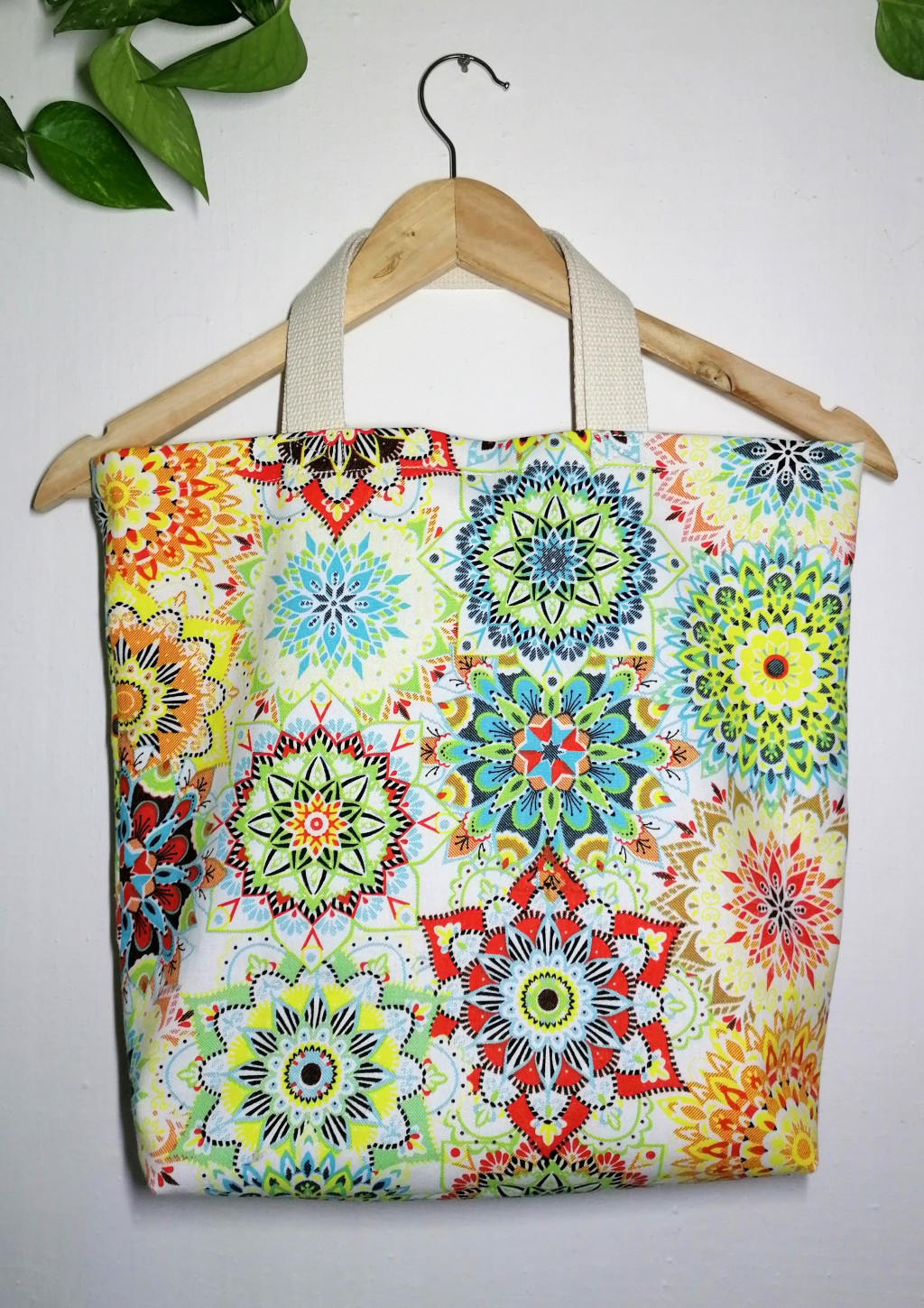 Egyedi, fehér alapon mandula mintás, bélelt textil kézitáska, jó tartású pamutvászon alapanyagból.