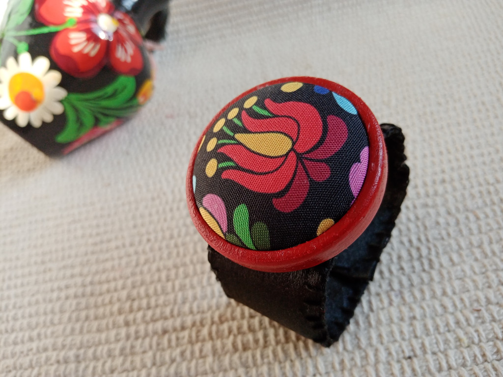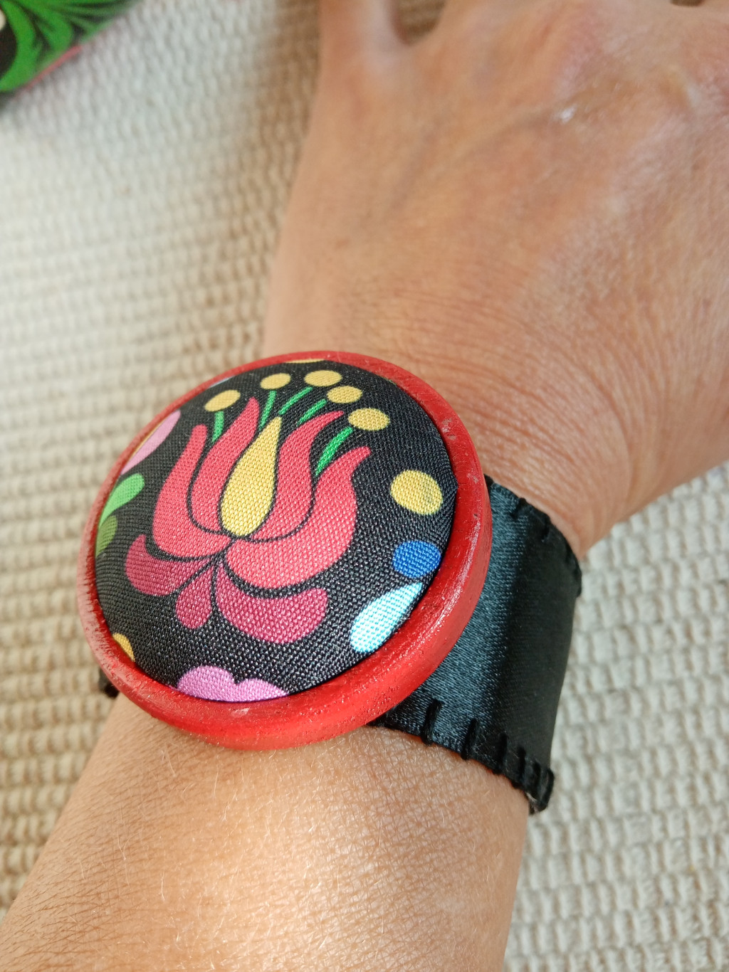 Kerek alakú faalapra készült matyó mintás magyaros karkötő, mely fekete selyemszalagra került fel. A faalap tölgyből készült, pirosra festettem. Egyedi karkötő Vékonyabb csuklóra ajánlott. 2:1-ben, mert nem csak körkötőként funkcionálhat, hanem sálgyűrűként is. Hajlítható, állítható, hiszen rézlemezre feszül a fekete selyemszalag.