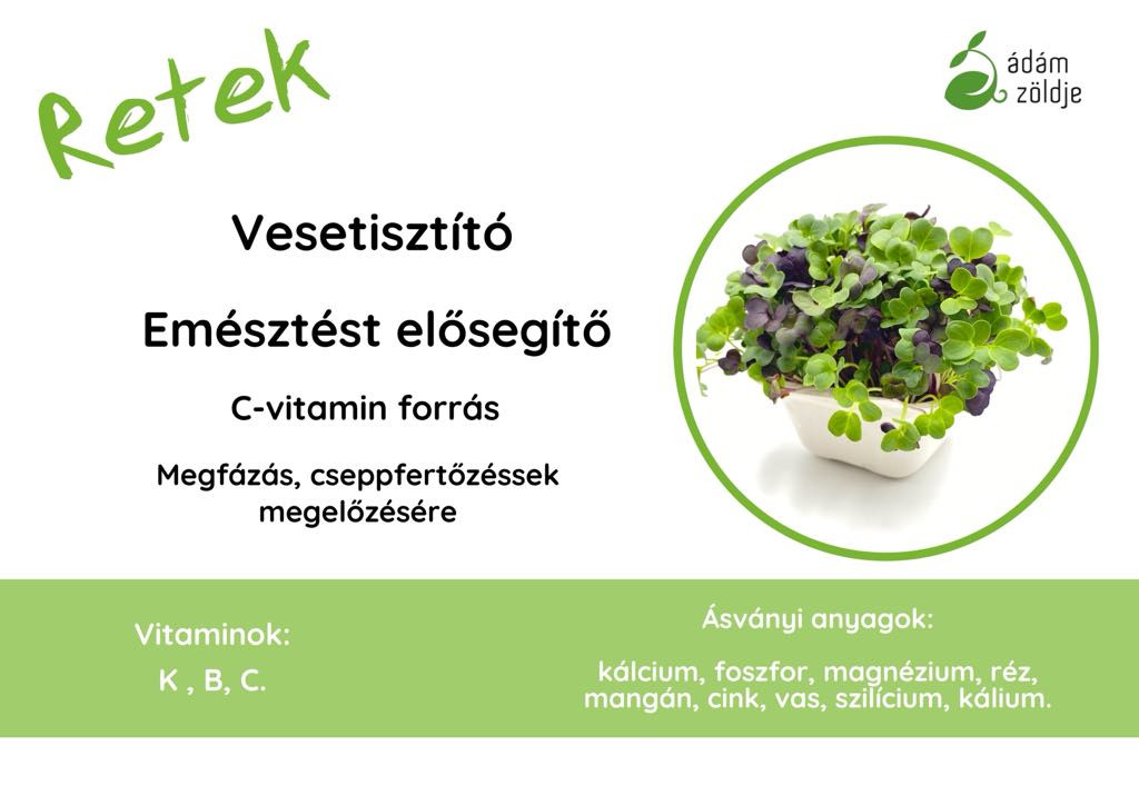 -vesetisztító -emésztést elősegítő -C-vitamin forrás -megfázás esetén, cseppfertőzések megelőzésére Vitaminok: K, B, C Ásványi anyagok: kalcium, foszfor, magnézium, réz, mangán, cink, vas, kálium Ha szeretnél többet megtudni mikrozöldjeinkről, látogass el honlapunkra: http://azmicrogreens.eu