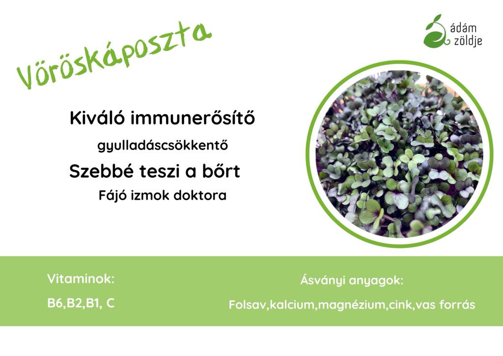Vöröskáposzta mikrozöld - kiváló immunerősítő - gyulladáscsökkentő -szebbé teszi a bőrt - fájó izmok "doktora" Vitaminok: B6, B2, B1, C Ásványi anyagok: Folsav, kalcium, magnézium, vas, cink Ha szeretnél többet megtudni mikrozöldjeinkről, látogass el honlapunkra: http://azmicrogreens.eu