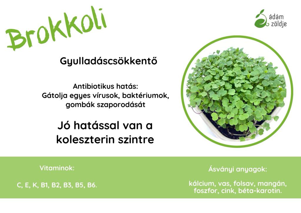 Brokkoli mikrozöld - gyulladáscsökkentő - antibiotikus hatás: gátolja egyes vírusok, baktériumok, gombák szaporodását - jó hatással van a koleszterin szintre Vitaminok: C, E, K, B1, B2, B3, B5, B6 Ásványi anyagok: Kalcium, vas, folsav, mangán, foszfor, cink, béta-karotin Ha szeretnél többet megtudni mikrozöldjeinkről, látogass el honlapunkra: http://azmicrogreens.eu