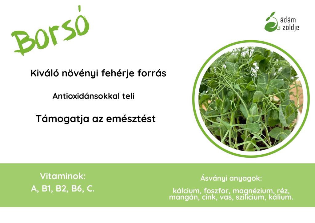 Borsó mikrozöld - kiváló növényi fehérje forrás - antioxidánsokkal teli - támogatja az emésztést Vitaminok: A, B1, B2, B6, C Ásványi anyagok: kalcium, foszfor, magnézium, réz, mangán, cink, vas, szilícium, kálium Ha szeretnél többet megtudni mikrozöldjeinkről, látogass el honlapunkra: http://azmicrogreens.eu