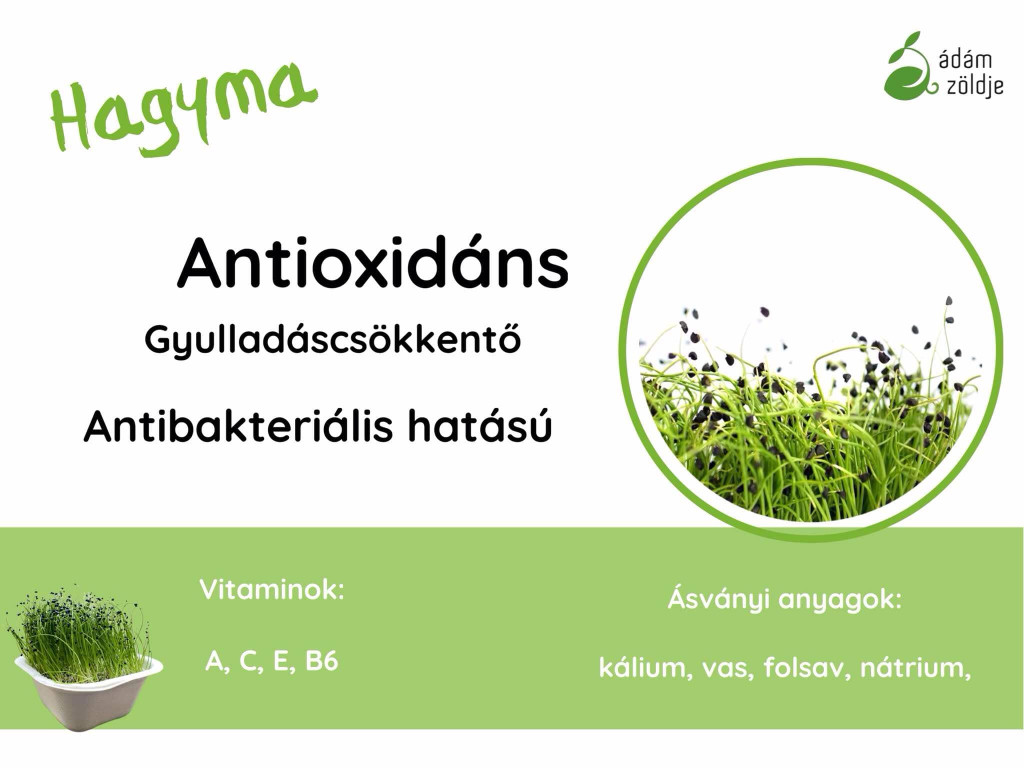 Hagyma mikrozöld - erős antioxidáns - gyulladáscsökkentő - antibakteriális hatás Vitaminok: A, C, E, B6 Ásványi anyagok: kálium, vas, folsav, nátrium Ha szeretnél többet megtudni mikrozöldjeinkről, látogass el honlapunkra: http://azmicrogreens.eu