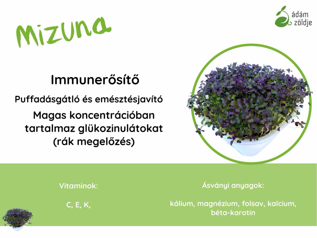 Mizuna mikrozöld (tormás ízvilág) - immunerősítő - puffadás és emésztésjavító - magas koncentrációban tartalmaz glükozinátokat Vitaminok: C, E, K Ásványi anyagok: kalium, magnézium, folsav, kalcium, béta-karotin Ha szeretnél többet megtudni mikrozöldjeinkről, látogass el honlapunkra: http://azmicrogreens.eu