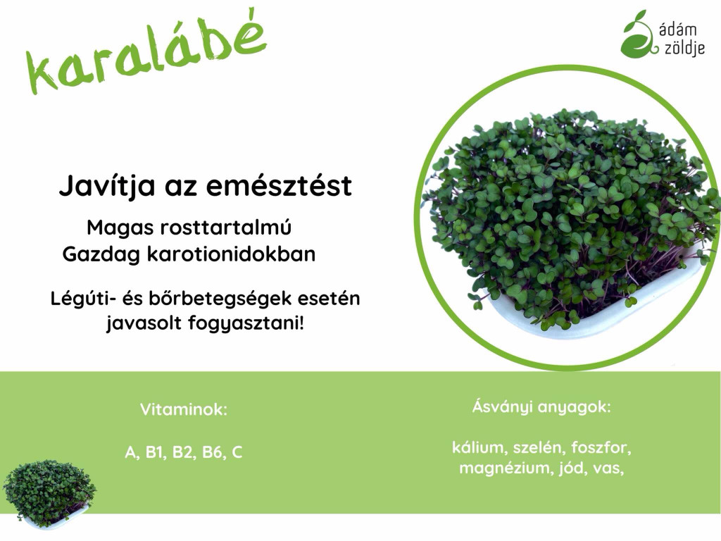 Karalábé mikrozöld -javítja az emésztést - magas rosttartalmú -karotinoidokban gazdag - légúti és bőrbetegségek esetlén javasolt fogyasztani Vitaminok: A, B1, B2, B6, C Ásványi anyagok: kálium, szelén, foszfor, magnézium, jód, vas Ha szeretnél többet megtudni mikrozöldjeinkről, látogass el honlapunkra: http://azmicrogreens.eu